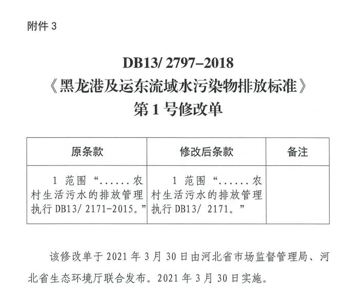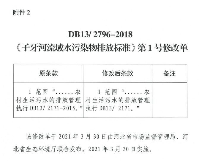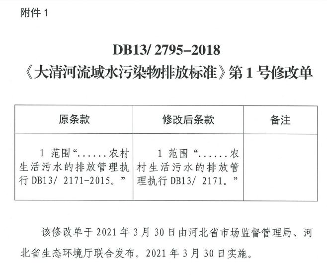 近日,河北省市場監督管理局、河北省生態環境廳發布《大清河流域水污染物排放標準》等3項強制性標準修改單,將“1 范圍”中的“農村生活污水的排放管理執行 DB 13-2171-2015”修改為“農村生活污水的排放管理執行 DB 13-2171”。