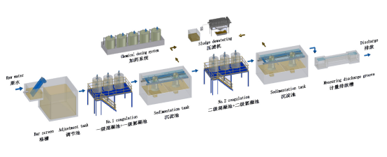 廢水從車間排放先經過格柵去除大顆粒懸浮物質后進入調節池,調節水質水量,然后由提升泵打入一級反應池,將單質磷氧化成磷酸根,然后進入一級混凝池,投加石灰形成磷酸鈣沉淀人,接著進入一級絮凝池形成大顆粒的絮體,后進入一級沉淀池進行固液分離而去除,然后進入二級反應、混凝及絮凝反應進一步的反應,再進入二級沉淀池以去除水中的含磷物質,上清液進入中間水池,然后由提升泵打入多介質過濾器進行過濾后進入排放水池,然后經計量排放槽計量排放。經壓濾后的污泥需定期委外處理。